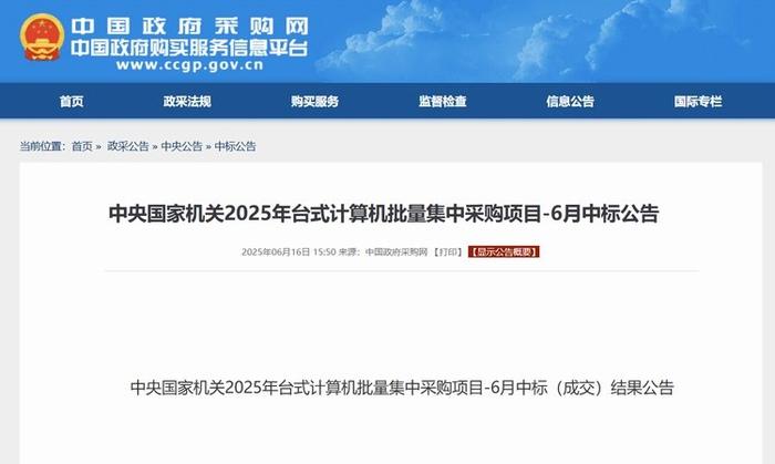 日前,中央國家機關2025年臺式計算機批量集中采購項目6月中標結果正式公布。