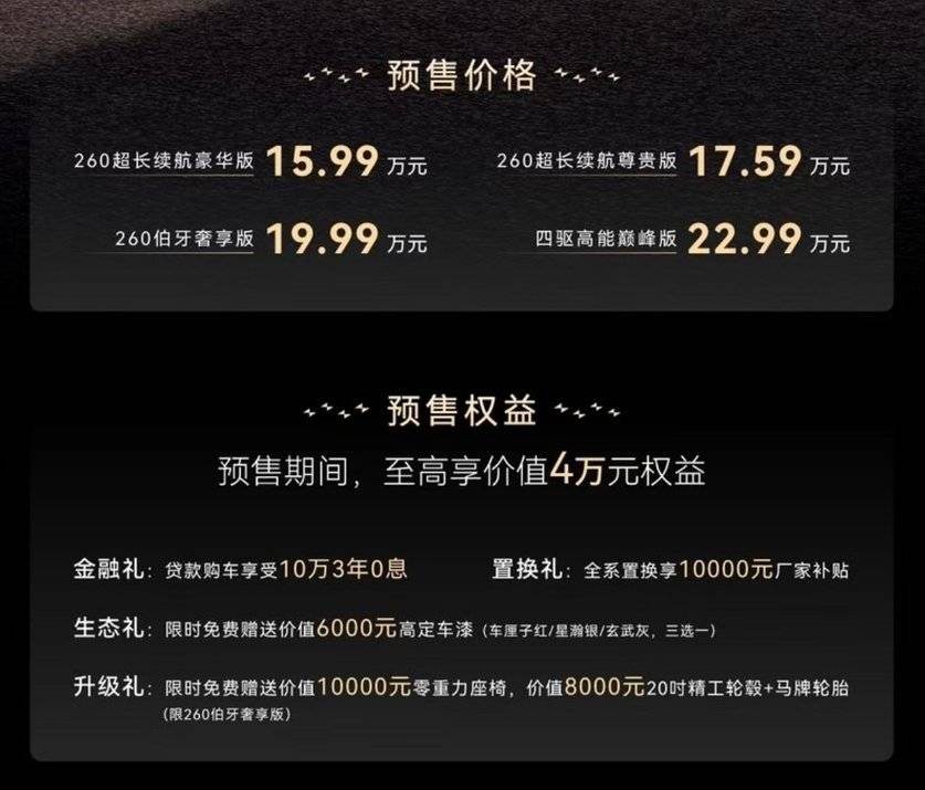 值得一提的是,同步推出的至高 4 萬元預售權益更是直擊用戶痛點:10 萬 3 年 0 息金融政策降低購車門檻,1 萬元置換補貼助力消費升級,限時贈送的高定車漆與零重力座椅等配置,直接將豪華體驗拉滿。這種 “頂配下放” 的定價策略,讓原本需要 30 萬 + 才能觸及的 C 級豪華體驗,如今以不到 20 萬的價格即可擁有,形成對傳統豪華品牌的降維打擊。
