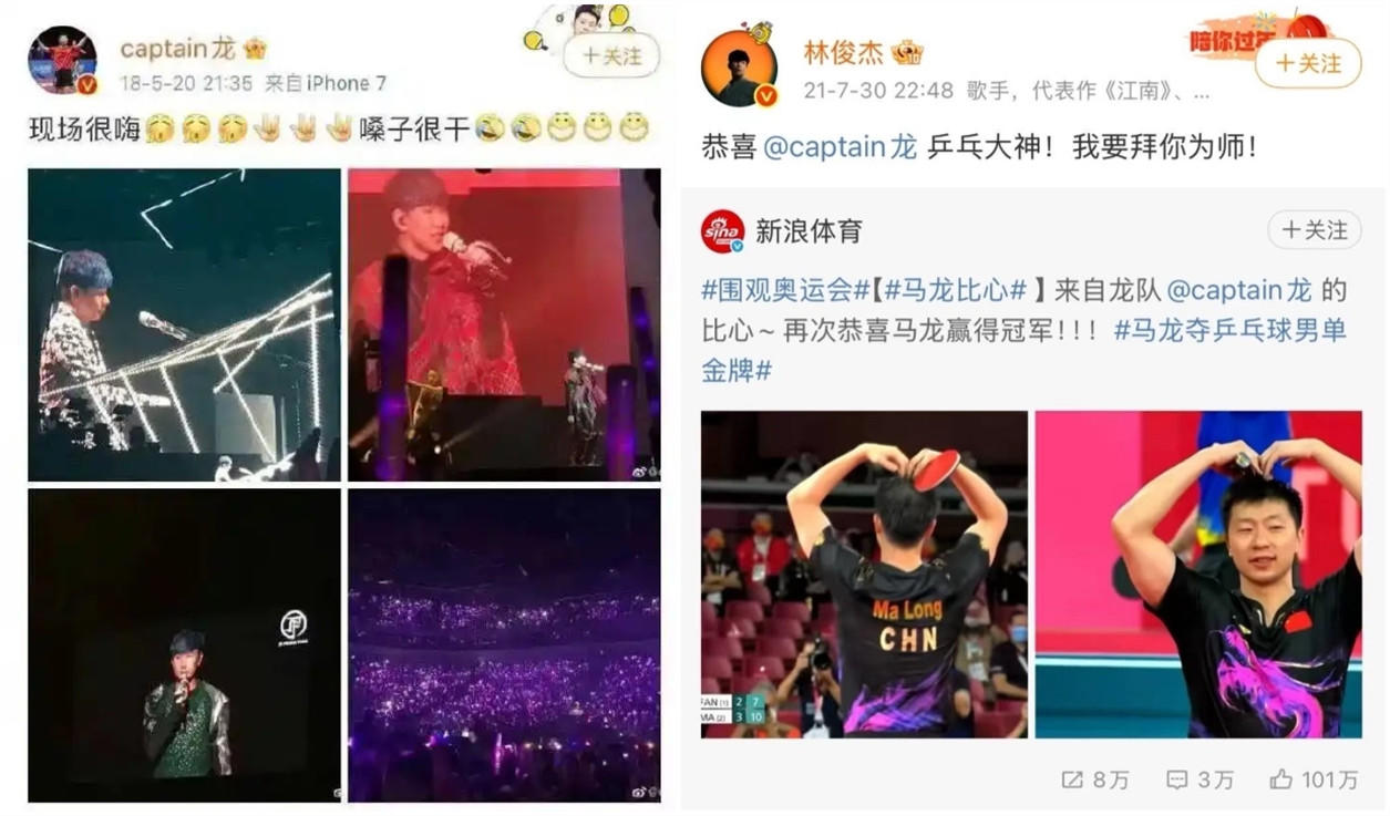 2018年,馬龍曾發微博分享林俊杰演唱會現場照片:“現場很嗨,嗓子很干”,2021年,林俊杰也曾轉發馬龍奪冠消息并表示:“乒乓大神,我要拜你為師!”
