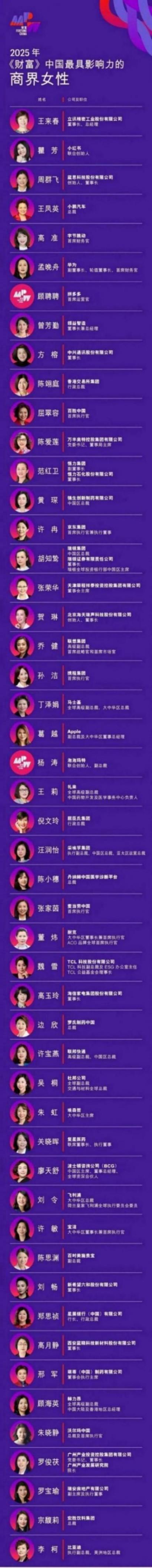 另外,在2025年榜單中,包括小鵬汽車總裁王鳳英、華為副董事長孟晚舟、攜程首席執行官孫潔、宏勝飲料集團總裁宗馥莉等多個行業熟悉的高層相繼入選。