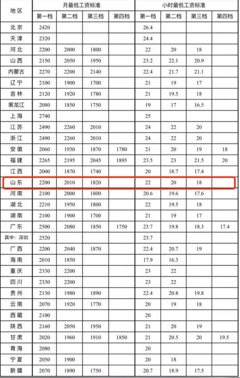 其中,山東第一檔月最低工資標準為2200元,第一檔小時最低工資標準為22元。