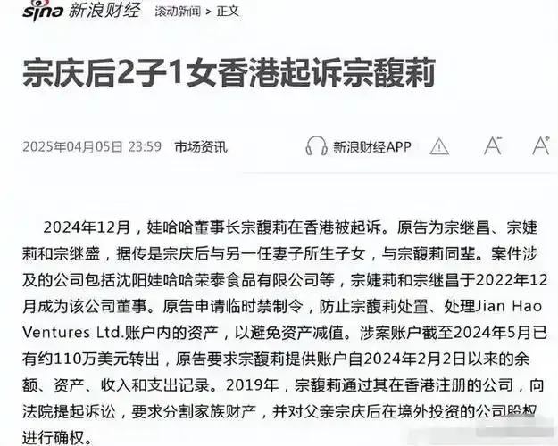 近日,宗慶后家族內斗再次成為公眾關注的焦點。宗慶后子女間的財產糾紛案持續發酵,其中,宗氏三兄妹(宗慶后與前妻所生)在香港對宗馥莉(宗慶后與現任妻子所生之女,現任娃哈哈集團副董事長兼總經理)提起訴訟的相關法律文書曝光,引發社會廣泛關注。
