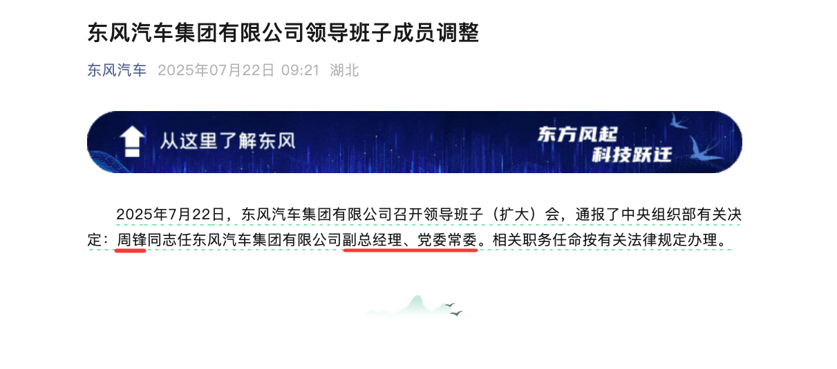 2025年7月22日,東風汽車集團會議室里,領導班子會議通報了中央組織部的決定,46歲的周鋒正式升任集團副總經理、黨委常委,成為東風領導班子中最年輕的核心成員。