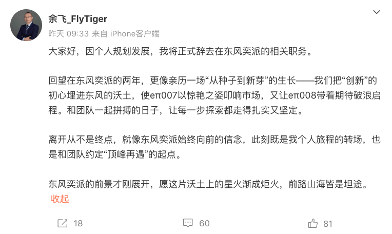 同一天,另一則人事變動在社交平臺引發關注:東風奕派營銷事業部總經理余飛在微博宣布“因個人規劃發展”辭去相關職務。