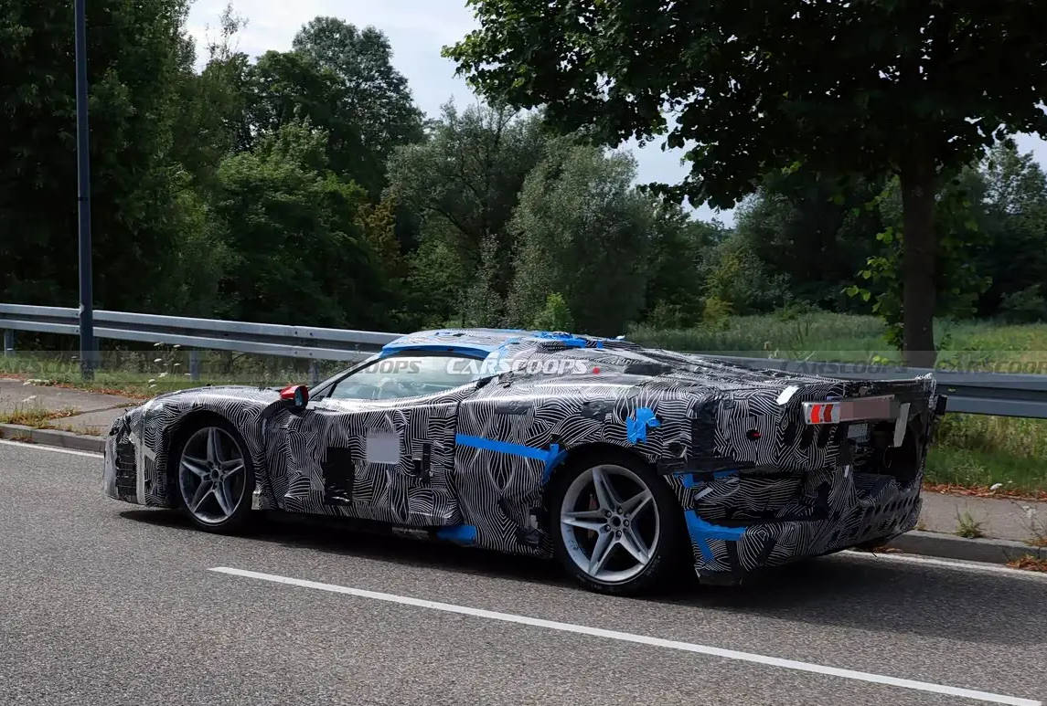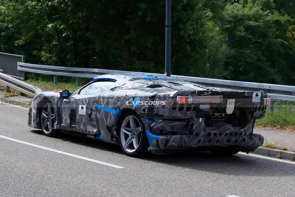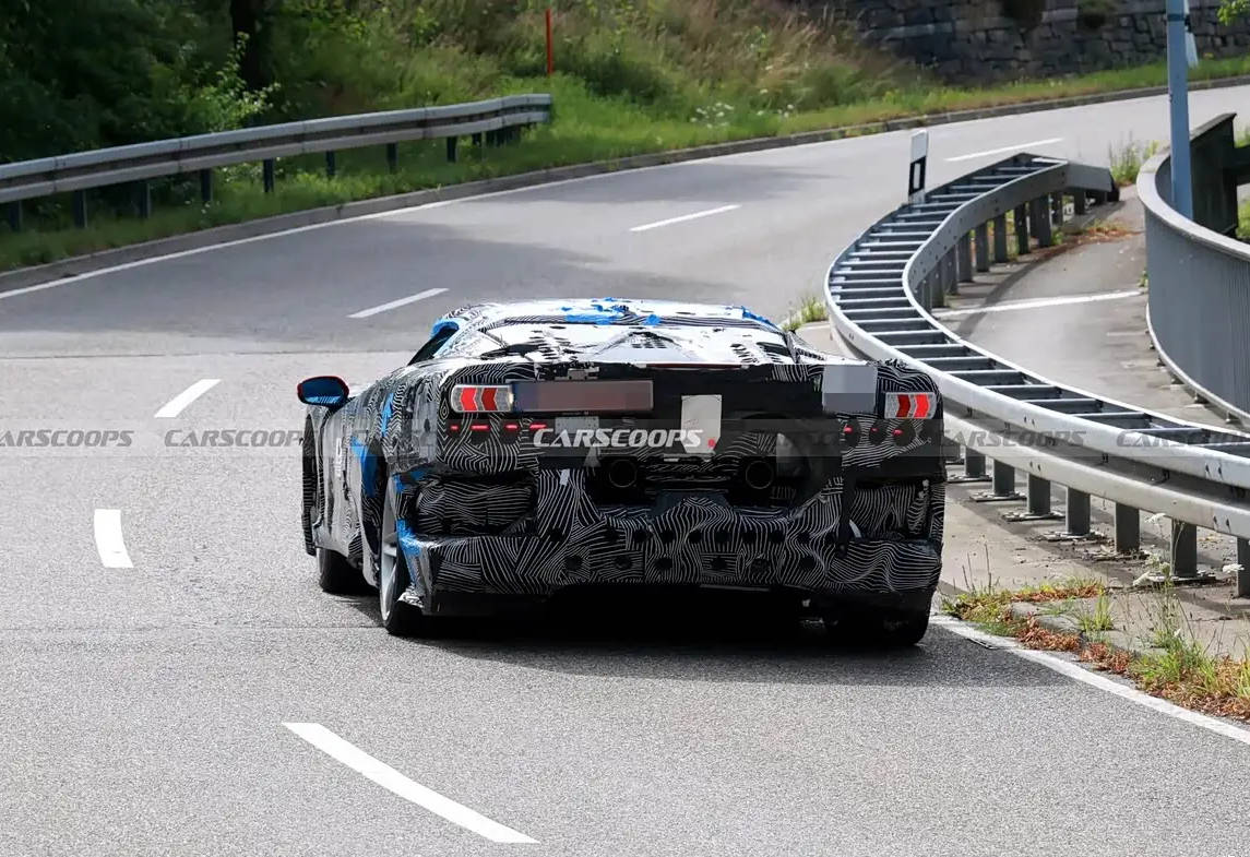 新車側(cè)面依舊是流暢的空氣動力學(xué)造型,車門處采用了鏤空的進氣口,風(fēng)格依舊十分戰(zhàn)斗。不過目前車身上覆蓋有大量偽裝材質(zhì),還不能看清其細節(jié)造型。車尾方面,車輛的整體包圍造型十分夸張,采用中置雙出的排氣布局,預(yù)計也將采用全新的尾燈組。