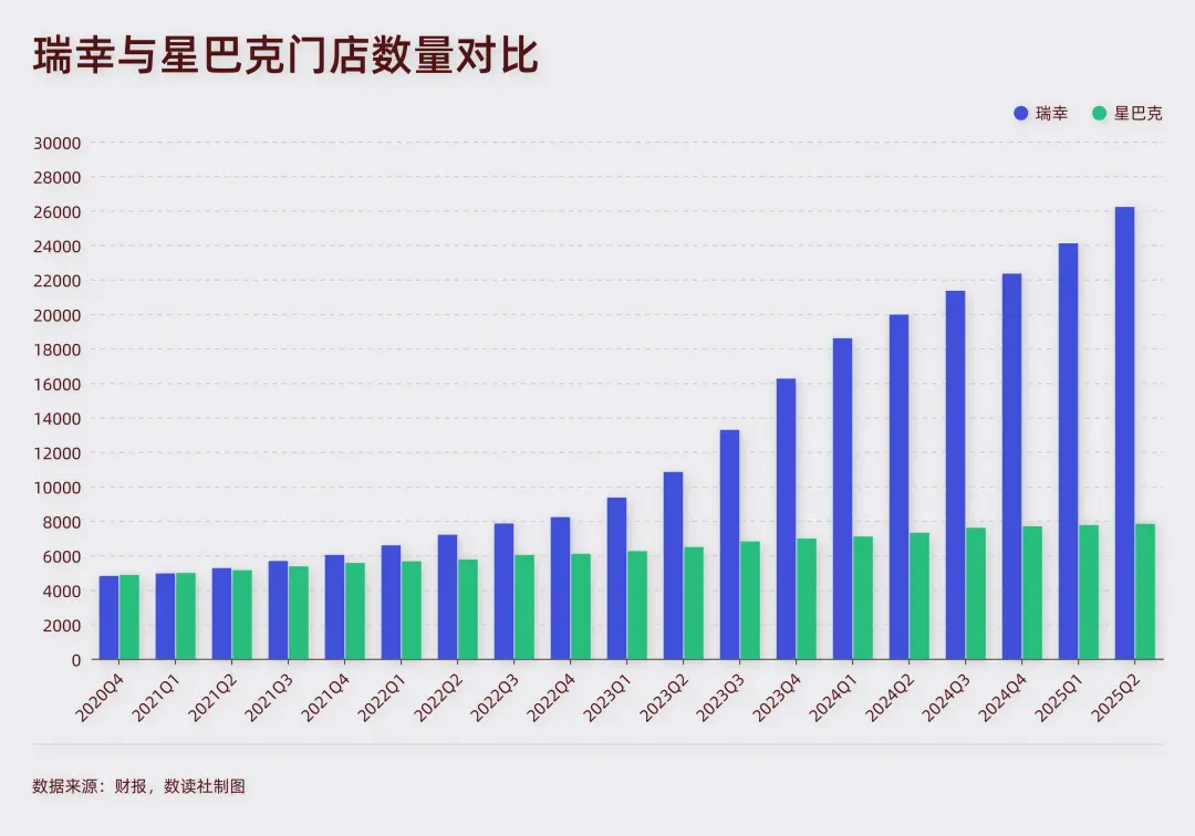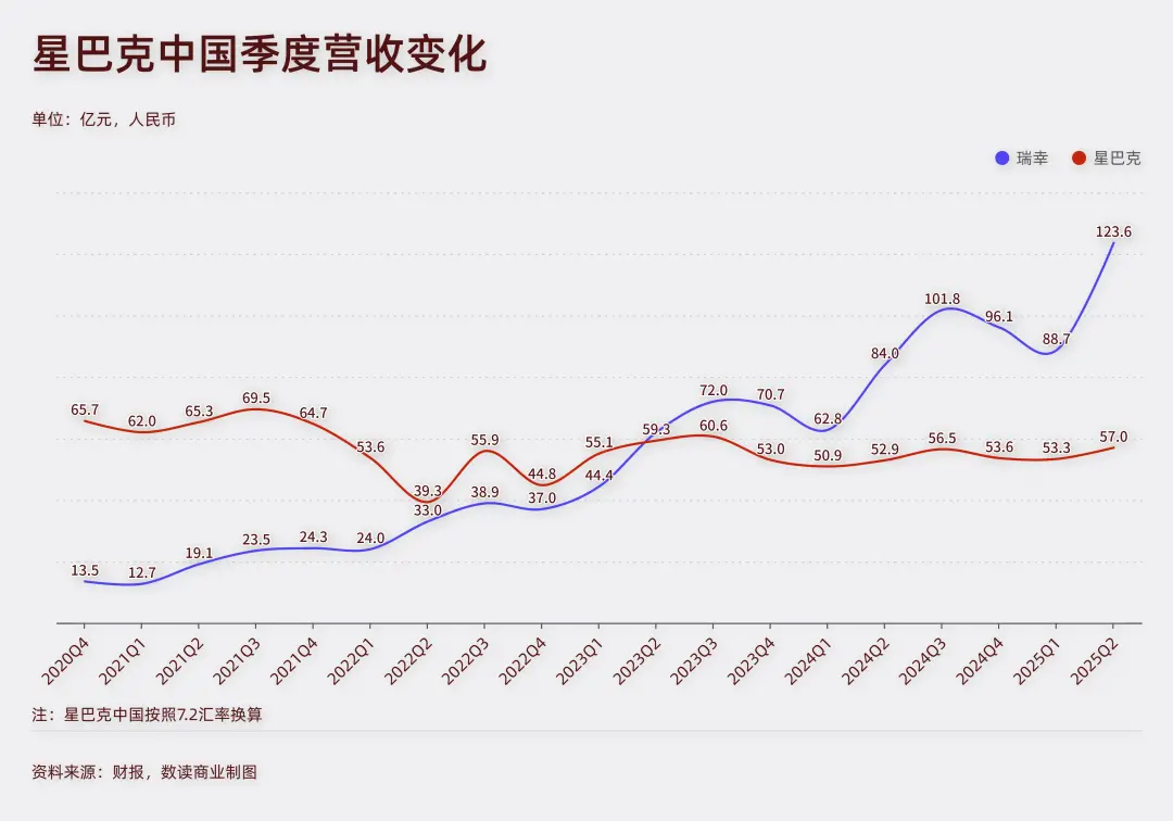 2021年二季度,瑞幸門店數量達到5259個,首次超越星巴克。2023年三季度,瑞幸營收62億元,首次實現單季度營收超過星巴克,這一年,瑞幸全年營收也超過了星巴克。