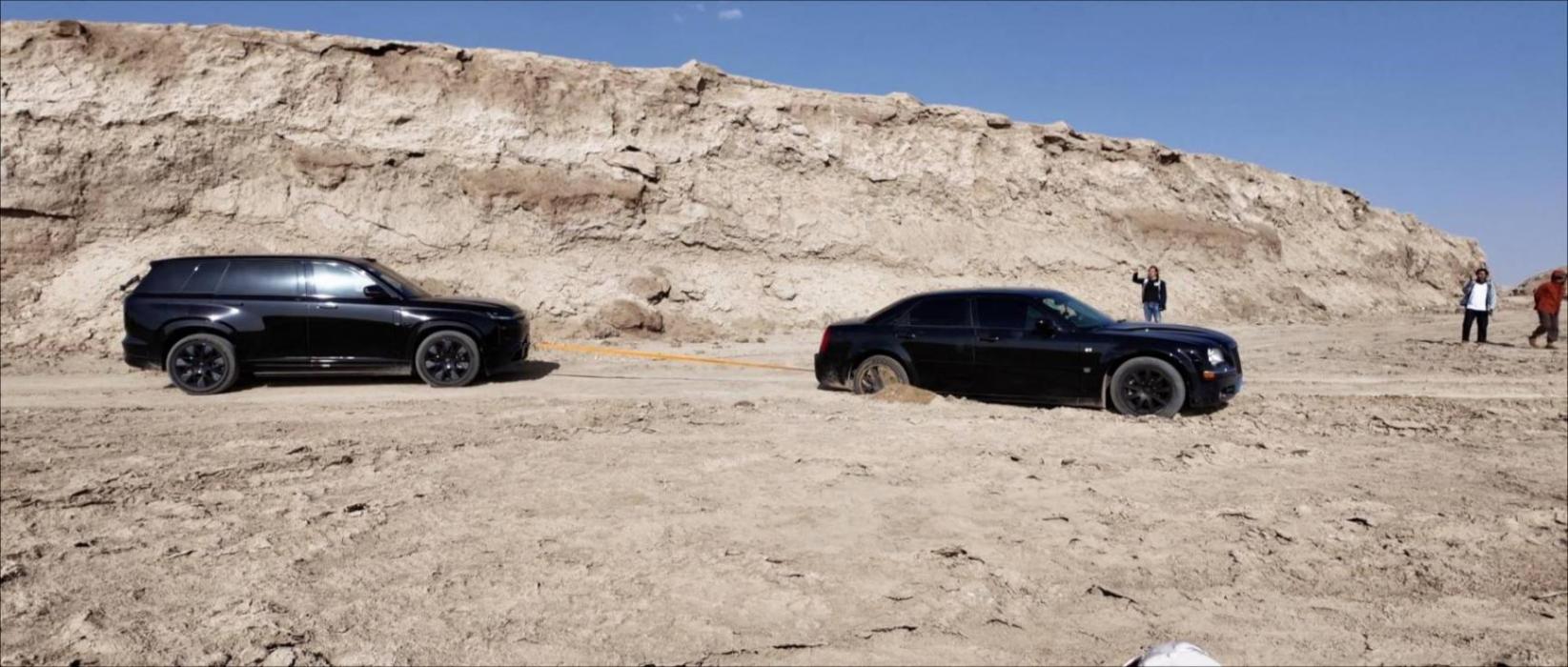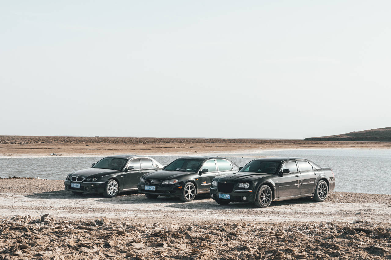 在從水上雅丹離開(kāi)后,仁哥邀約大家駕車(chē)進(jìn)入道路旁的戈壁,探索一處鹽堿覆蓋的湖泊。在數(shù)次觸底后,我們才剛到達(dá)目的地,就發(fā)現(xiàn)四周遍布松散的泥沙,在仁哥的瞎指揮里,整備質(zhì)量比我們多了近300kg的克萊斯勒300C后驅(qū)動(dòng)輪陷車(chē)。自救無(wú)果后,它還是靠隨行工作車(chē)的拖拽才脫離險(xiǎn)境。