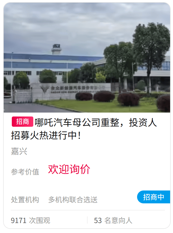 另據阿里資產官方平臺顯示,哪吒汽車的母公司合眾新能源汽車,從7月10日起開啟重整意向投資人預招募通道,不到一個月的時間,已經有將超50名投資人報名。破產重整的哪吒汽車反而成了香餑餑。