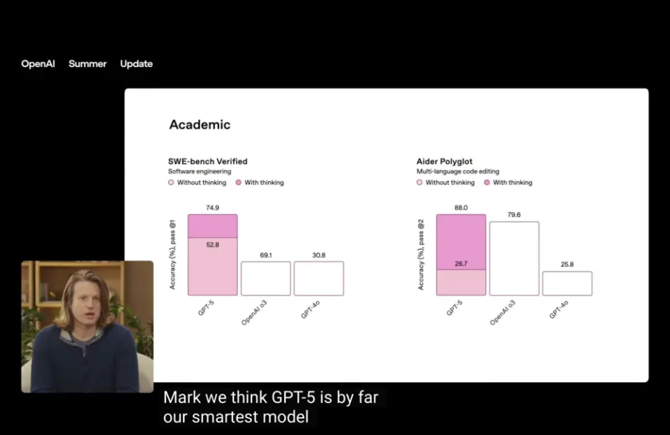 在現場演示之前,OpenAI先是一如既往地展示了GPT-5的一連串標桿成績。