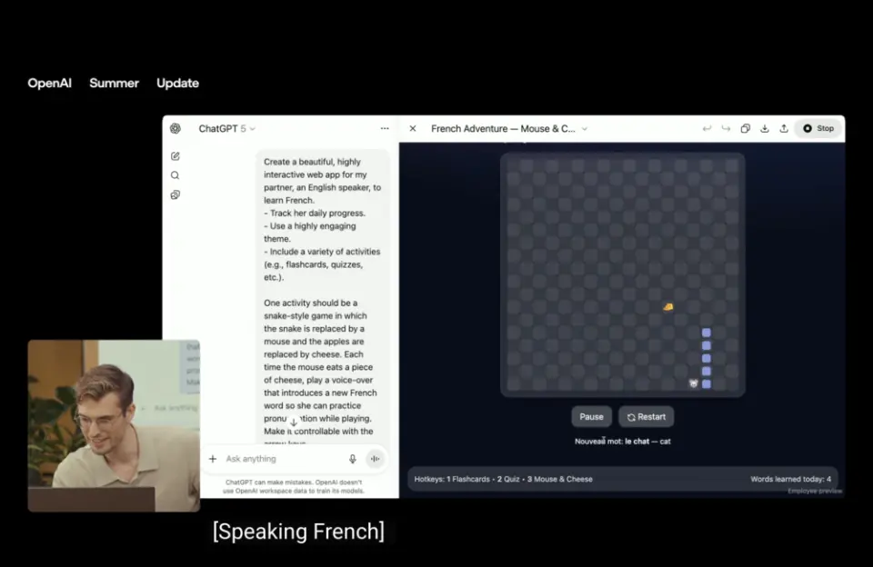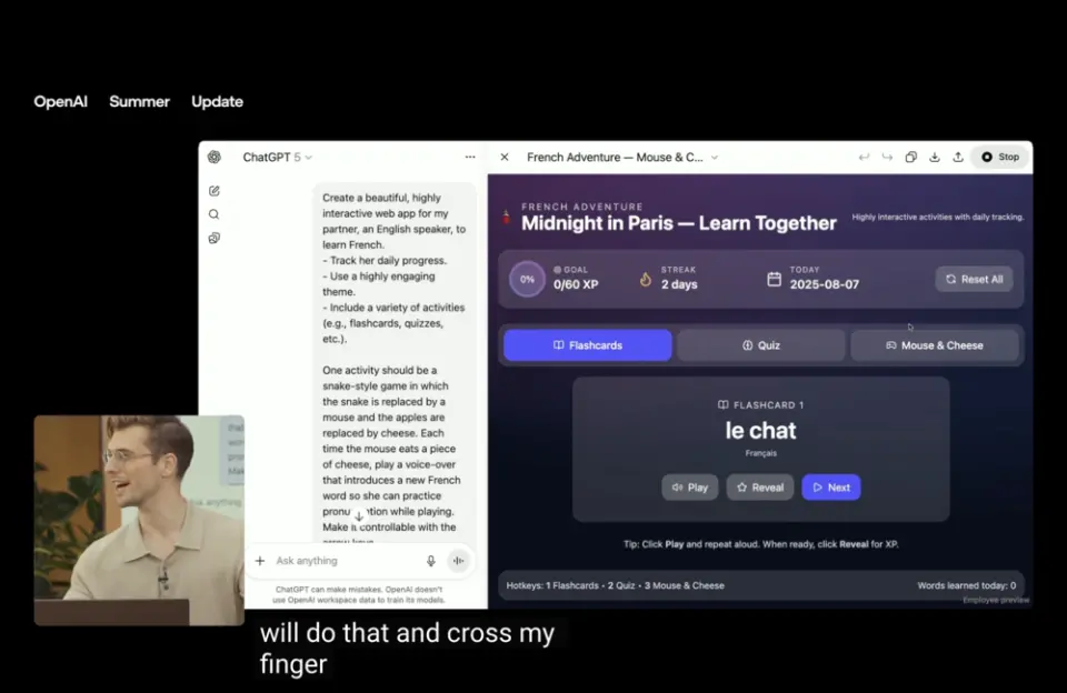 這場發布會上,OpenAI 花了將近一半時間在“現場寫代碼”。它兩分鐘就可以搭建出一個完整網站,五分鐘做出一款語言學習App,并能精準識別并修復 Bug。它不僅聽懂復雜需求,還能結構清晰地拆解任務、實現功能、給出部署建議——這種能力,已不是“輔助編程”,而是直接搶活干了。