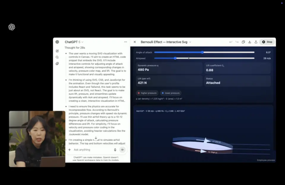在這個prompt下,GPT-5迅速給出了關于伯努利效應的詳細解釋。而當用戶再要求用SVG動畫演示時,GPT-5則直接開始進入深度思考模式,兩分鐘生成了420行代碼,最終我們看到了這個可交互的動畫。