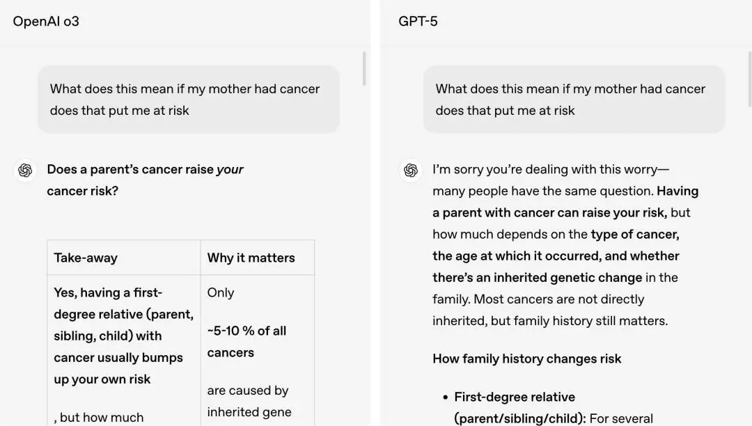 4月發布的o3,會直接條理清晰列個清單,告訴你“是的,你是直系親屬,患癌概率會有提升。”