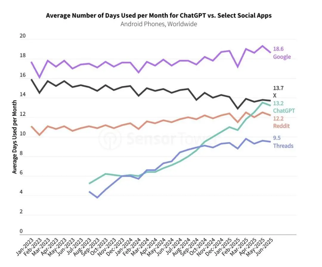 據SensorTower數據,2025年7月,ChatGPT已經成為在iOS和Google Play上達到10億全球下載量的最快應用,僅僅幾個月后,它就成為達到5億月活躍用戶(月活用戶)的最快應用(不包括預安裝)。