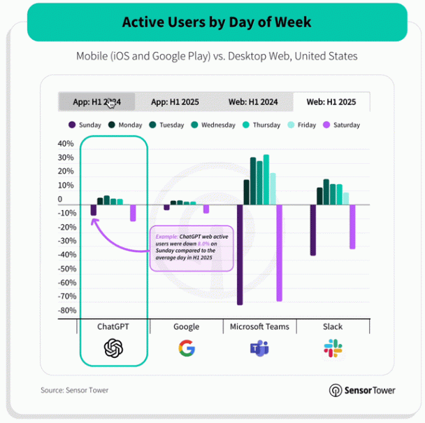 一個表現是,AI的“打工”屬性也在減弱。在2024年,ChatGPT的周末用量增長會明顯比周中減少近10%;但到了2025年,趨勢已經顯著放緩。