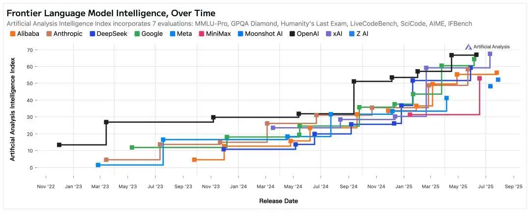 模型智能水平躍遷曲線,從2025年開始,各家模型和OpenAI(黑色折線)的差距顯著縮小 △來源:Artificial Analysis