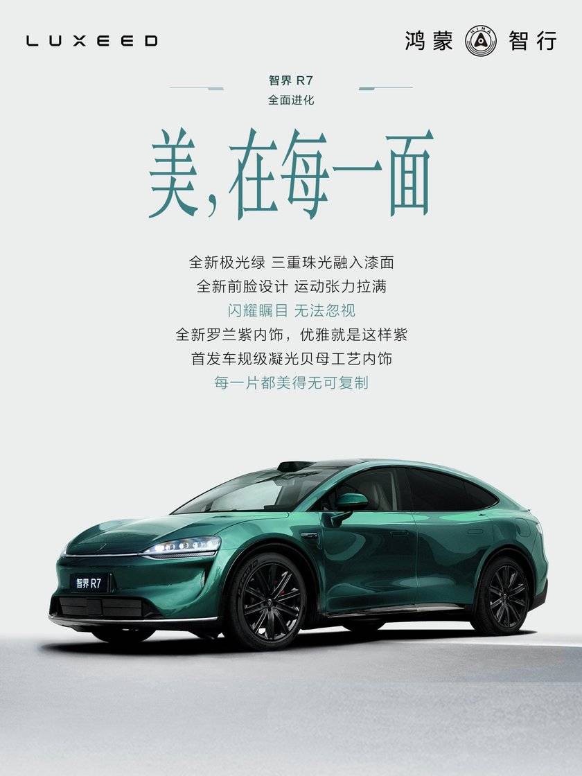 新款車型首發極光綠車漆成最鮮明的視覺符號,三層珠光漆工藝在光線流轉間呈現藍綠漸變效果,靈感源自極地夜空的神秘光影,車身隨光線變化像把極光裝進了車里。新款車型首次搭載智界家族化六邊形LOGO,以"鴻蒙智行"基因強化品牌辨識度。前后保險杠線條更凌厲,貫穿式星軌尾燈在夜間點亮時形成流動光帶。