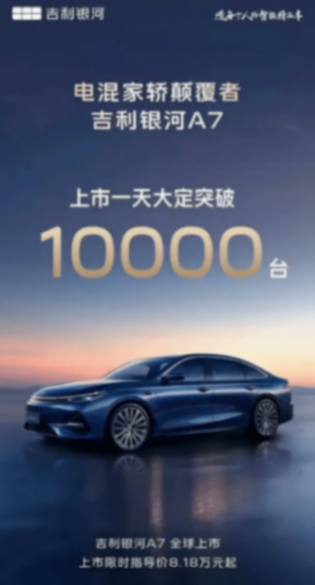8 月 9 日消息,吉利今日宣布,銀河 A7 上市 1 天大定突破 1 萬臺,限時指導價 8.18 萬元起。