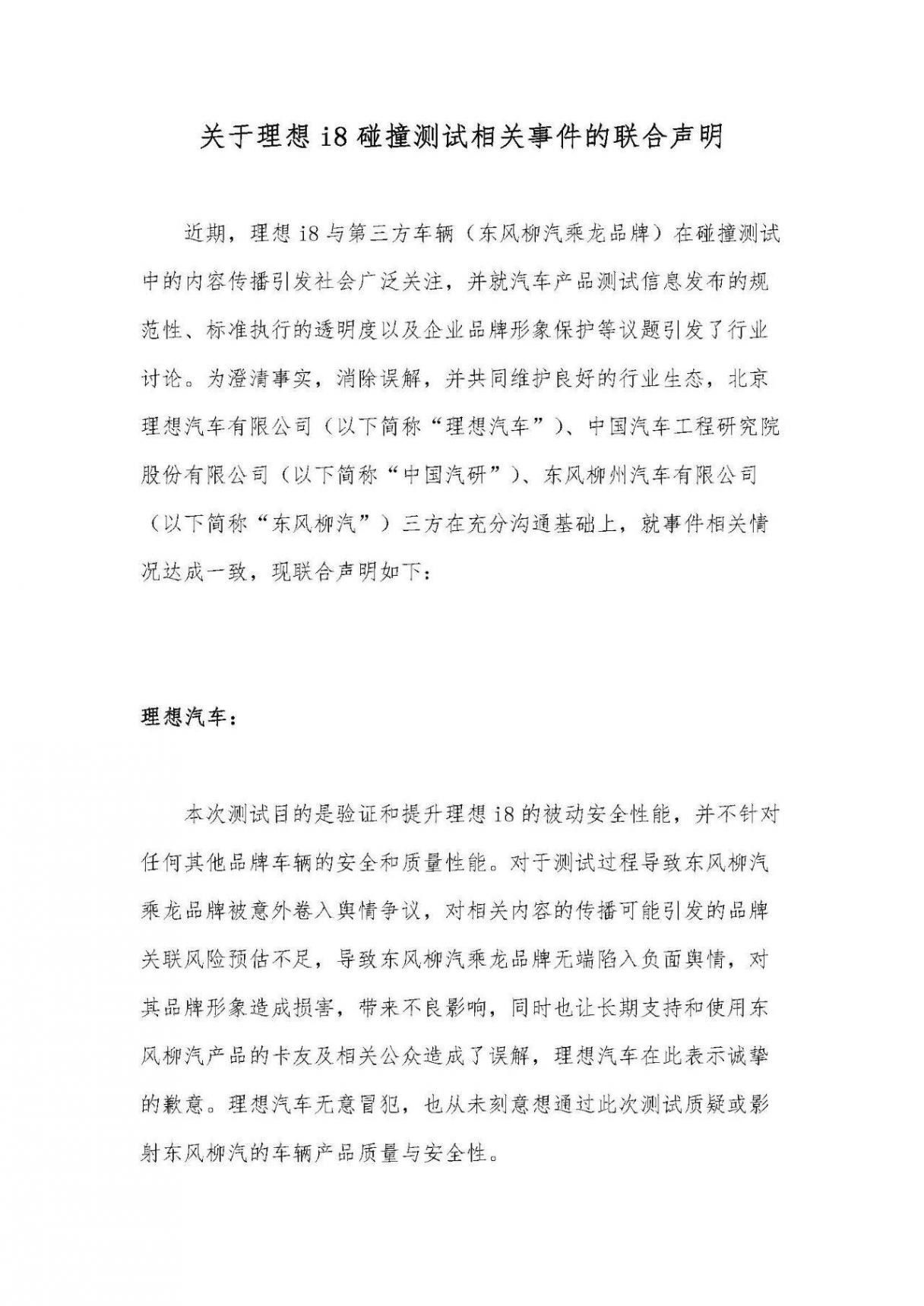 7月31日晚間,在理想汽車高管表示“碰撞視頻絕對真實,不相信可以再撞一次”時,東風柳汽發布了第一份官方聲明,表示“某汽車品牌使用特定場景測試,與實際場景運營存在嚴重差異。截至目前我司了解到的情況,某汽車品牌未公開測試車輛狀況(雙方車輛是否改裝、減配、卡扣是否固定、車輛是否過檢等)、場景環境(測試場地狀況、車速、駕駛狀態等),通過自定義碰撞條件,特定設計非常規測試場景,發布與公眾認知的正常碰撞結果偏差較大的碰撞視頻,不僅貶低我司品牌形象,還容易對廣大車主造成誤導,形成安全隱患。”