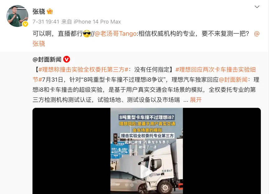 隨著事件的持續“發酵”以及三方共同聲明的發布,一些真相也浮出水面:第一,測試所用卡車實為經特殊改裝的二手車,屬于“移動壁障車”,脫離了量產車的安全標準;第二,理想i8對撞試驗采用正面碰撞,為特定設計場景,在現實中發生概率不足5%,多數為追尾或偏置碰撞;第三,対撞時卡車為空載狀態,與真實道路上的滿載工況存在很大差異,不符合實際。