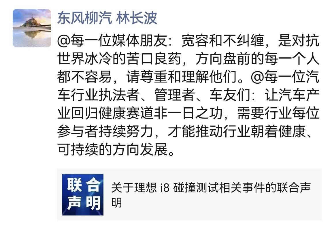 東風柳州汽車有限公司總經理林長波也在朋友圈發文,表示“寬容和不糾纏,是對抗世界冰冷的苦口良藥,方向盤前的每一個人都不容易,請尊重和理解他們。”同時,林長波表示,讓汽車產業回歸健康賽道非一日之功,呼吁行業每位參與者持續努力,推動行業朝著健康、可持續的方向發展。