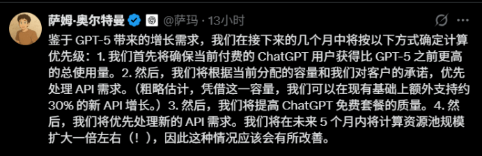 ▍應(yīng)對GPT-5需求增長,OpenAI CEO奧爾特曼公布算力分配計劃