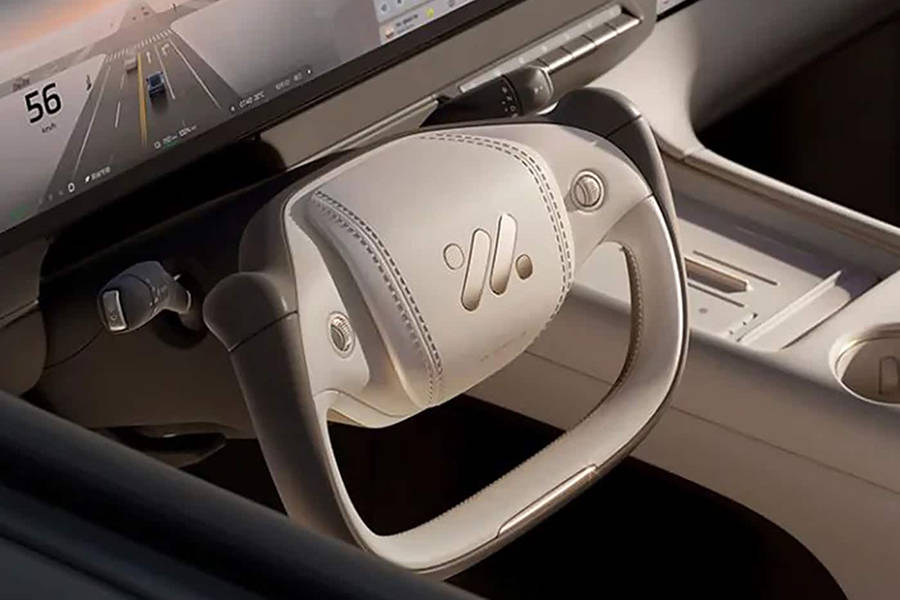 內飾方面,全新智己LS6依然采用三塊屏,主駕與中控的5K高清屏幕貫穿相連,副駕娛樂屏為3K屏幕,整個臺面很有層次感,空調出風口貫穿式設計,并展現出金屬質感。此外,新車保留了一定的物理按鍵,屏幕下方依然為無線充電面板,下部提供儲物空間,中控臺上方提供懸浮式揚聲器。值得一提的是,新車依然會提供半幅式方向盤。