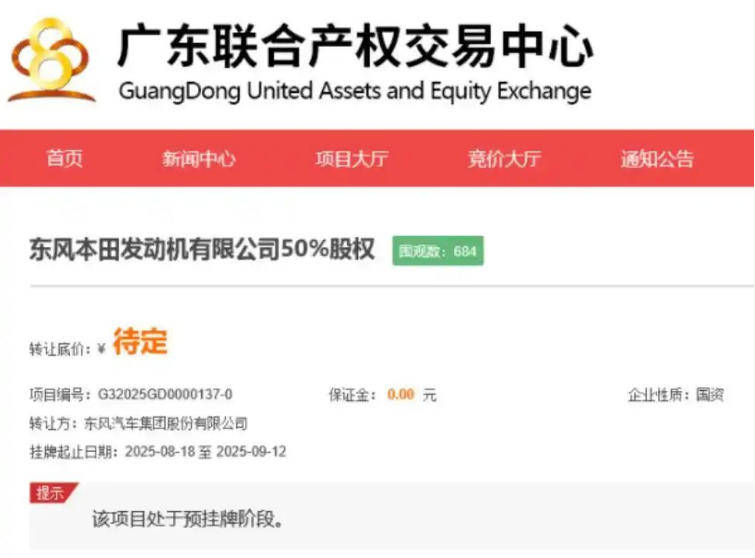 近期廣東聯(lián)合產(chǎn)權(quán)交易中心官網(wǎng)的一則預(yù)掛牌信息,揭示了汽車產(chǎn)業(yè)轉(zhuǎn)型大潮中一個(gè)標(biāo)志性事件。東風(fēng)汽車集團(tuán)宣布將出售其持有的東風(fēng)本田發(fā)動(dòng)機(jī)有限公司50%股權(quán)。