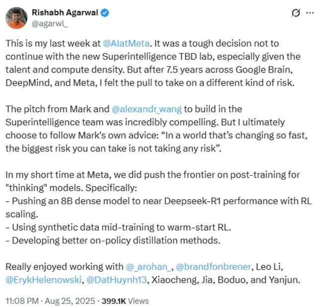 以百萬美元年薪于四月加入這家科技巨頭的 AI 科學家Rishabh Agarwal,首先在Meta從事生成式 AI 項目,后轉入Meta 超級智能實驗室。在加入短短五個月后,他現已宣布離職以追逐"另一種形式的冒險"。