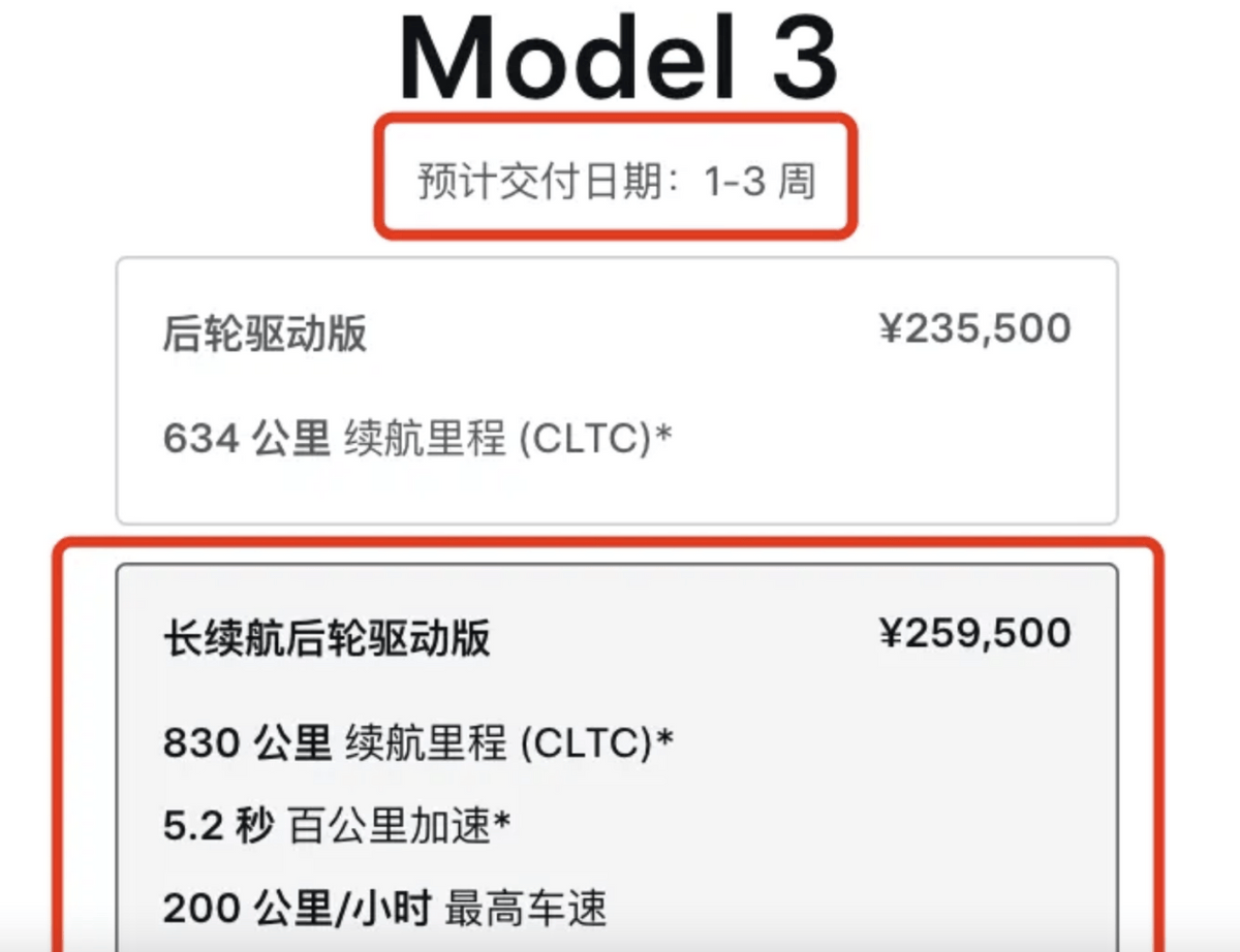 Model 3長續航后驅版售價為25.95萬元,新車整個外觀造型基本和此前在售車型一致,重點針對配置升級,即搭載了78.4kWh電池組,CLTC工況續航里程為830km,也是續航最長的Model 3,并且交付周期為1-3周。