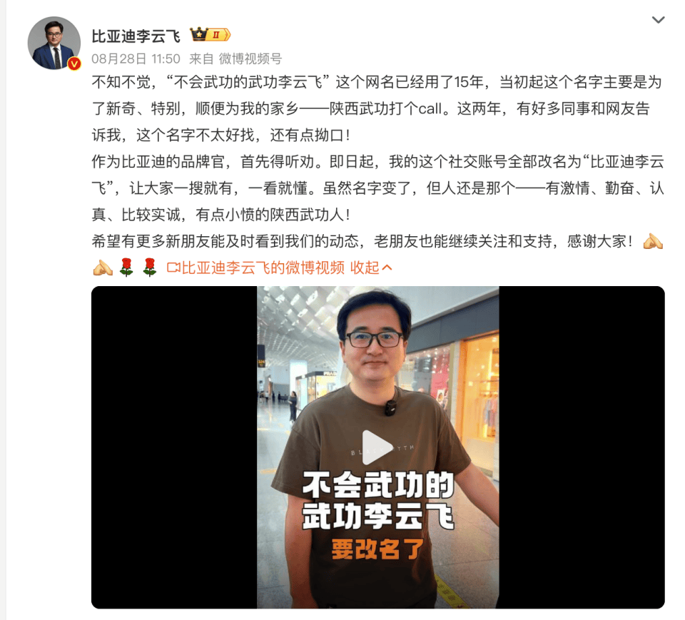 而就在8月28日,也就是成都車展開幕的前一天,比亞迪在社交平臺上發(fā)布消息,宣布自己所有社交平臺的ID名稱,都將改為“比亞迪李云飛”,用調(diào)侃一點的話來說,比亞迪高管,“痛失”家鄉(xiāng),因為兩個“武功”都沒了……