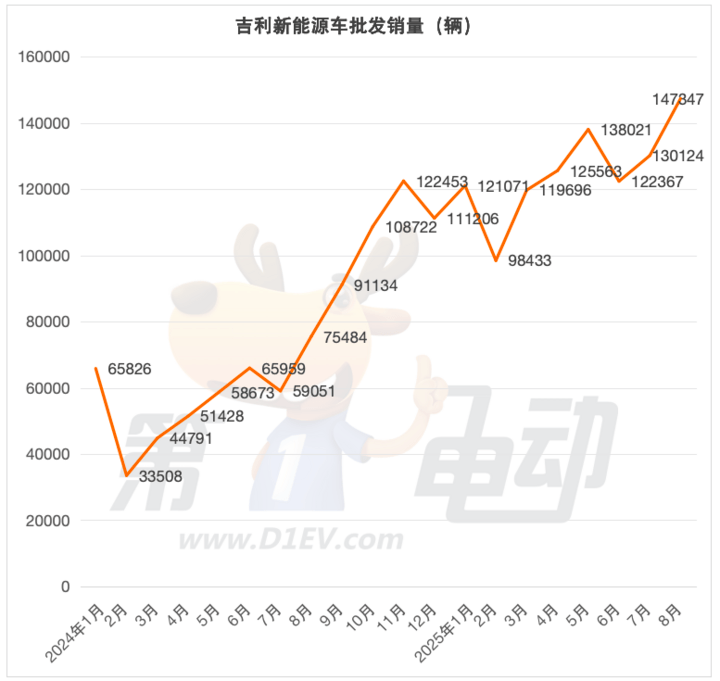 吉利新能源8月銷量達(dá)14.73萬(wàn)輛,環(huán)比上漲13.2%,同比大漲95%,創(chuàng)歷史紀(jì)錄,緊隨比亞迪其后。