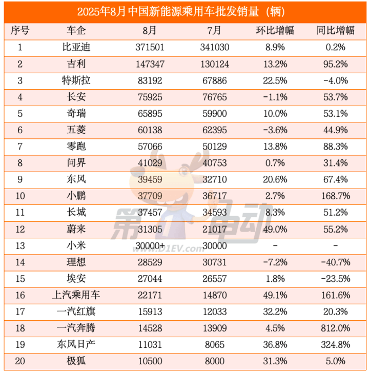 比亞迪雖以371501輛的8月銷量保持領(lǐng)先,但其同比僅增0.2%,增幅大幅收窄,1-8月累計(jì)銷量完成率也僅達(dá)原全年目標(biāo)的51.5%。有媒體報(bào)道稱,比亞迪可能將年度目標(biāo)下滑16%。