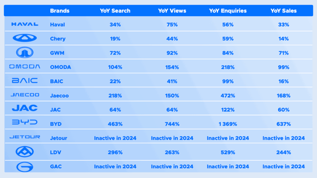 為了進(jìn)一步展現(xiàn)南非市場對(duì)于中國品牌日益增長的興趣,AutoTrader SA還展示了除銷量外的其他數(shù)據(jù)指標(biāo):其網(wǎng)站上中國汽車的搜索量同比增長了67%,咨詢量增長了81%,獨(dú)立廣告瀏覽量翻了一番,這表明,盡管這些品牌在市場上的整體影響力尚在萌芽階段,但其關(guān)注度正在快速提升。