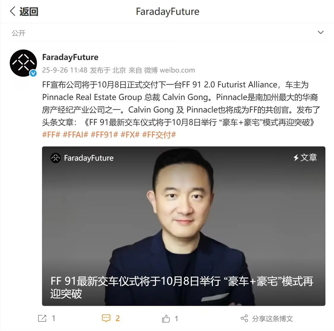 9 月 26 日消息,法拉第未來官方微博 @FaradayFuture 今天(9 月 26 日)發(fā)布博文,宣布將于 10 月 8 日正式交付下一臺 FF 91 2.0 Futurist Alliance,車主為 Pinnacle Real Estate Group 總裁 Calvin Gong。