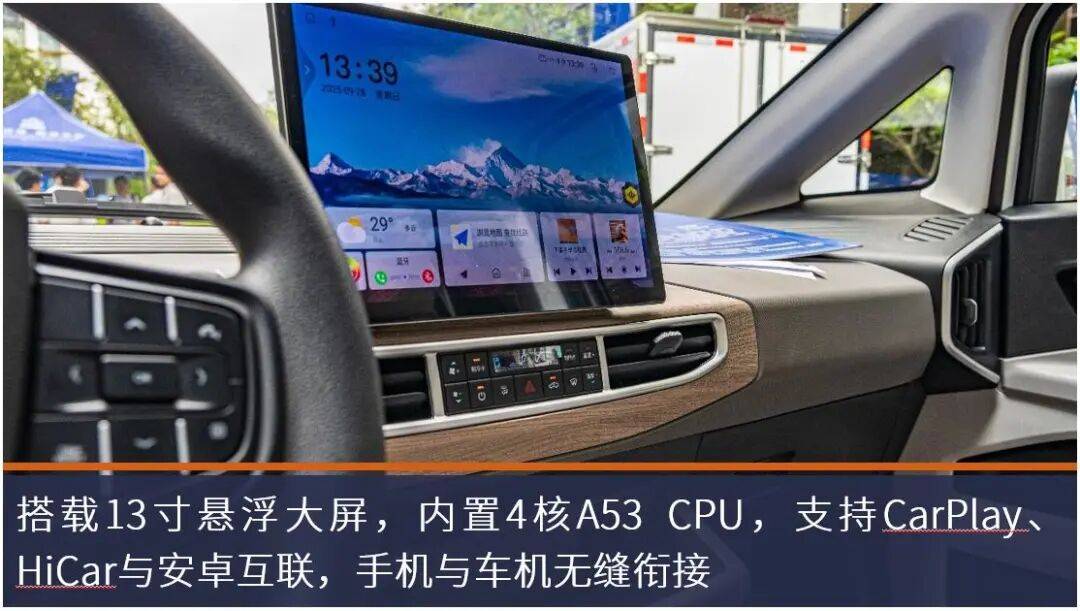 座艙智能方面,搭載13寸懸浮大屏,分辨率達1920×1200,顯示清晰細膩;內(nèi)置4核A53 CPU,運行流暢,支持CarPlay、HiCar與安卓互聯(lián),手機與車機無縫銜接,導航、接打電話更便捷。