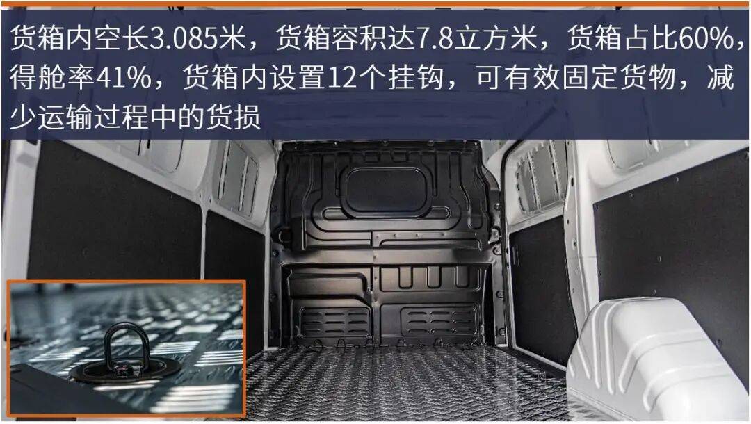 貨箱尺寸方面,其貨箱內(nèi)空長3.085米,貨箱容積達8立方米,得艙率41%,能輕松容納大體積、多批次貨物,滿足城配、城際運輸中的“多拉”需求。同時,貨箱內(nèi)設置12個掛鉤,可有效固定貨物,減少運輸過程中的貨損,降低經(jīng)濟損失。