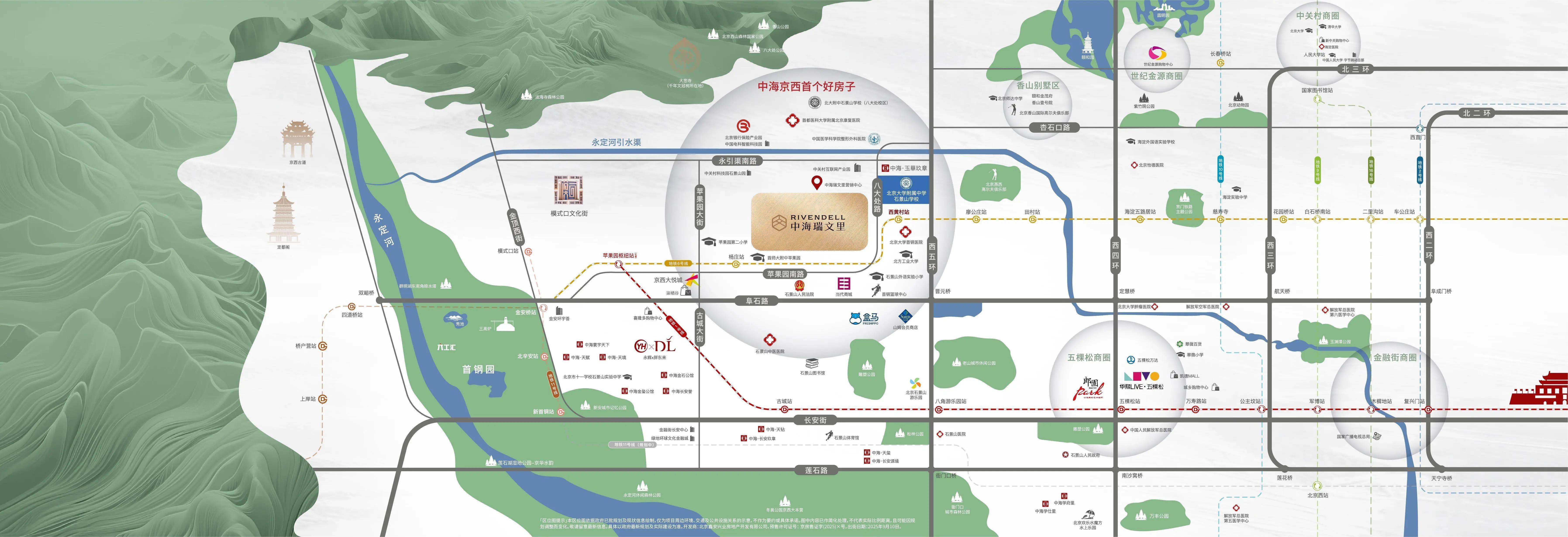 商業:約1.3公里到達姆會員店,約1.5公里抵達京西大悅城, 2.5公里內可達喜隆多購物中心,周邊還有遠洋春秋里、環宇薈等商業。