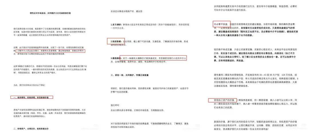 而倡議的一個核心內容在于“抱團取暖”,即建議業主定價前參考近半年正常成交價,而非極端低價;不急于賣房的業主撤盤或掛高價,避免造成“房源過剩”假象;急于成交的業主優先在業主群“內部消化”,既省中介費又能隱藏低價;同時提醒鄰居勿信開發商營銷噱頭,強調一期現樓“即買即入學”的優勢,優于二期存在的收樓風險。