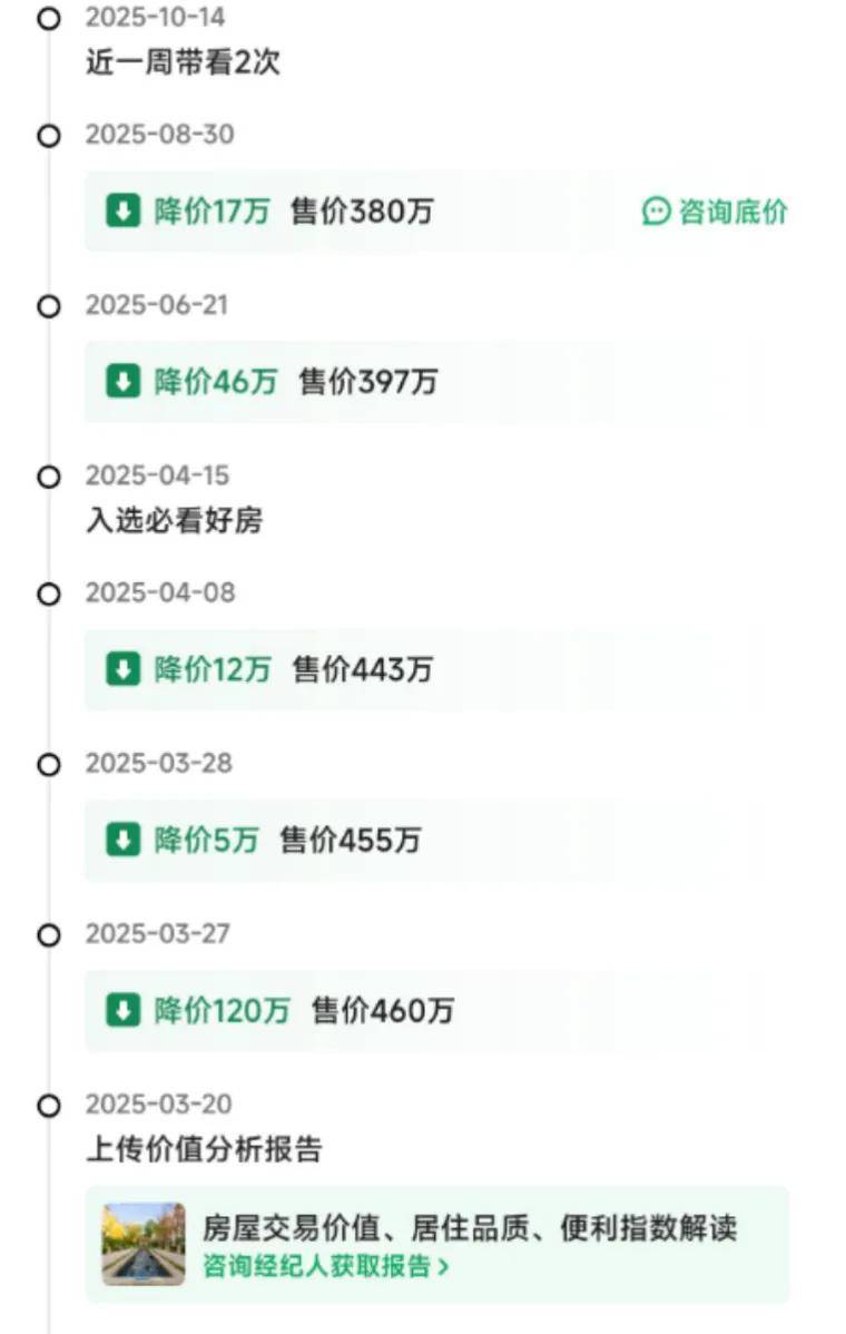 以鏈家數據為例,同樣一套約104平方米房源,去年12月成交價為470萬元,折合單價4.5萬元/平方米,而到今年10月,有業主掛牌總價回落到了375萬元,折合單價約3.61萬元/平方米。