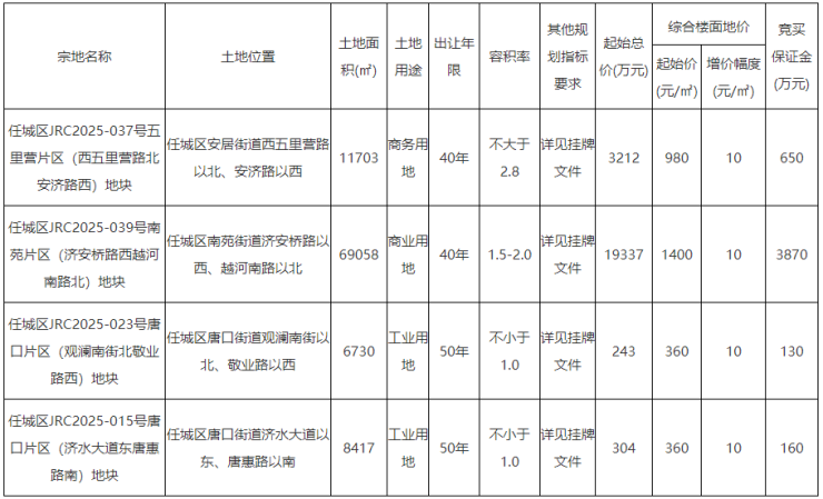 4. 任城區JRC2025-015號唐口片區(濟水大道東唐惠路南)地塊:2025年11月25日9時00分至2025年12月5日9時30分;