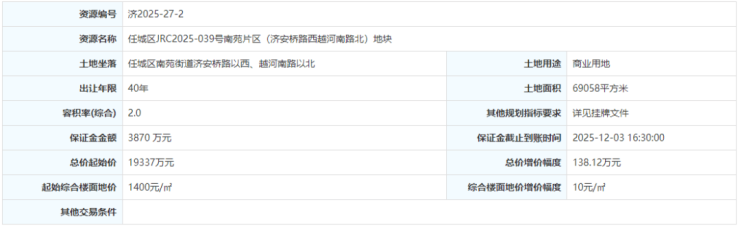 2. 任城區JRC2025-039號南苑片區(濟安橋路西越河南路北)地塊:2025年11月25日9時00分至2025年12月5日9時10分;