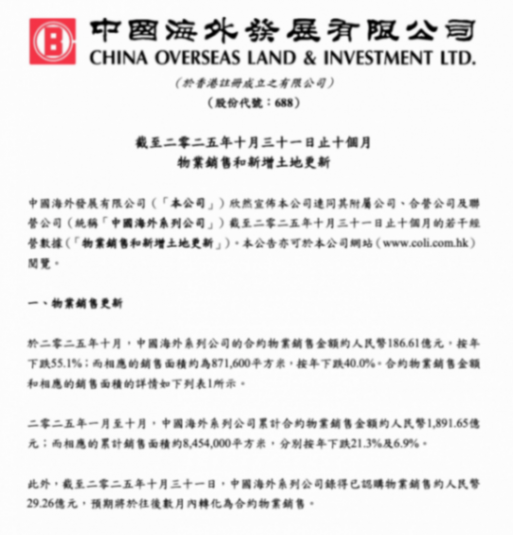 11月6日,中國海外發(fā)展公布截至2025年10月31日止十個月的物業(yè)銷售和新增土地更新情況。