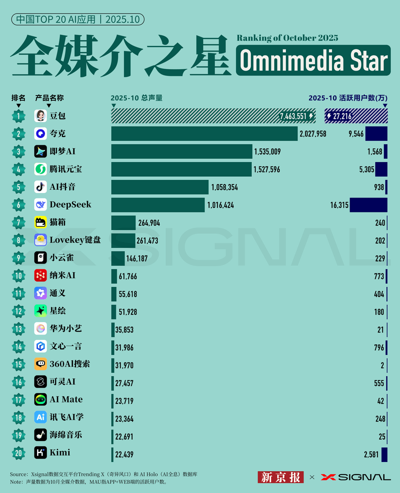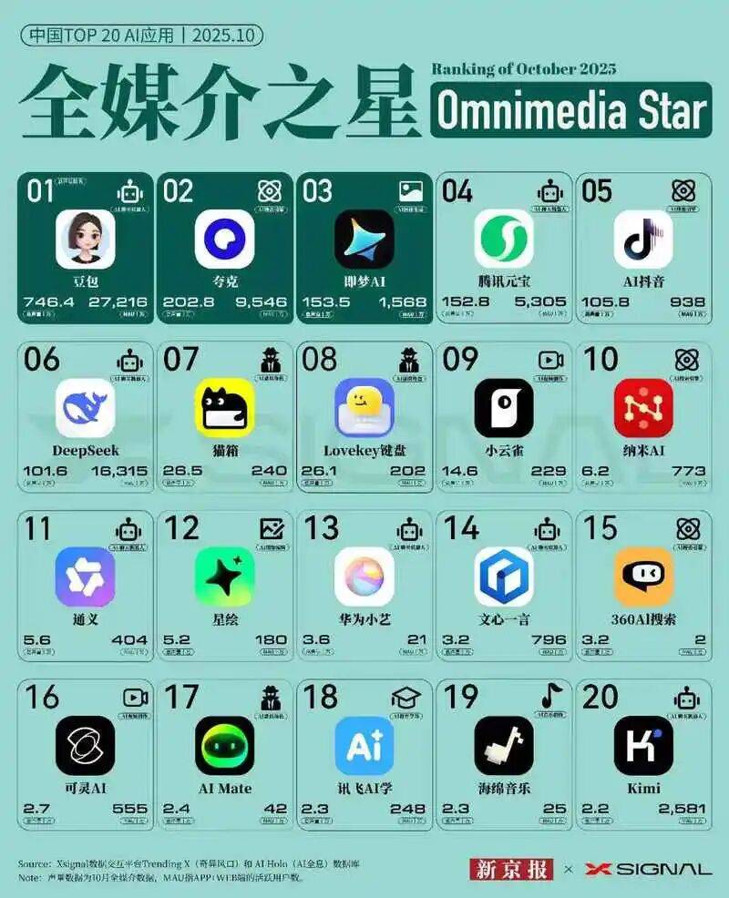 這份榜單由新京報AI研究院與Xsignal聯合發布,根據全媒介聲量梳理出2025年10月排名前20的國內AI應用,同時統計了應用的產品類別、所屬企業及最新MAU(月活躍用戶)數據,為觀察國內AI應用發展趨勢提供重要參照,這也是榜單自發布以來的第四期。