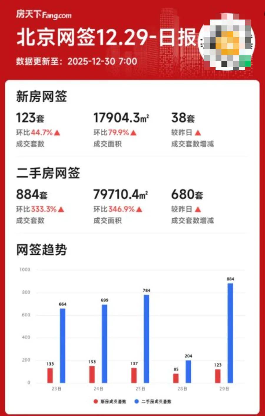 單是12月29日一天,二手房成交套數環比前一日暴增333.3%。
