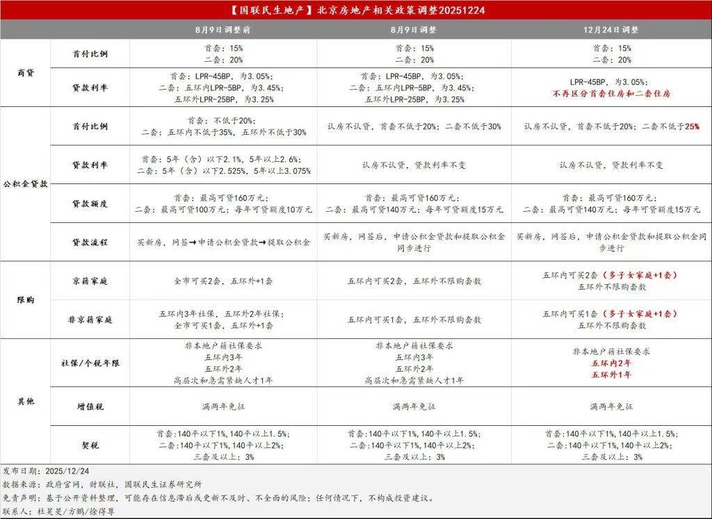 12月24日,北京市住房城鄉建設委、北京市發展改革委、人民銀行北京市分行、北京住房公積金管理中心等4部門聯合印發《關于進一步優化調整本市房地產相關政策的通知》(以下簡稱《通知》),自2025年12月24日起施行。