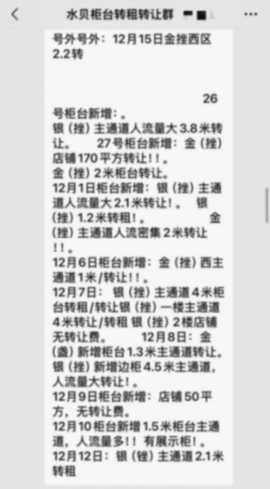 一個水貝柜臺轉(zhuǎn)租轉(zhuǎn)讓群中,群主持續(xù)更新水貝柜臺轉(zhuǎn)讓信息。“柜臺新增,店鋪50平方,無轉(zhuǎn)讓費”“1.5米柜臺主通道,人流量多,有展示柜。”