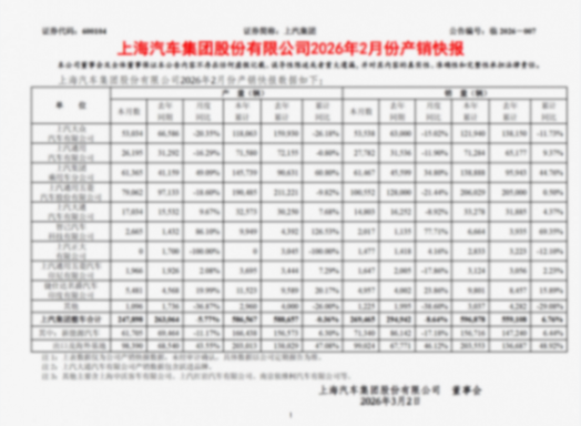 3月1日,上汽集團(tuán)發(fā)布2026年2月及1-2月累計(jì)銷量數(shù)據(jù)。數(shù)據(jù)顯示,該集團(tuán)2月份實(shí)現(xiàn)整車銷售26.9萬輛,結(jié)合1月份銷量,1-2月累計(jì)銷售59.7萬輛,同比增長6.8%,在1月取得開門紅后,繼續(xù)保持行業(yè)領(lǐng)跑態(tài)勢。