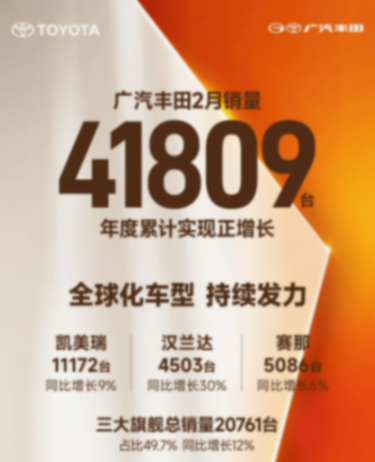 具體來看,廣汽旗下凱美瑞、、賽那三大旗艦車型成為銷量核心支撐。2月份,三款車型合計售出20761輛,占當月總銷量的49.7%,接近五成,同比增長12%,為品牌銷量增長提供主要增量。其中,漢蘭達表現尤為突出,當月銷量4503輛,同比大幅增長30%;凱美瑞銷量11172輛,同比增長9%;賽那銷量5086輛,同比增長6%,三大旗艦車型均實現同比正增長。