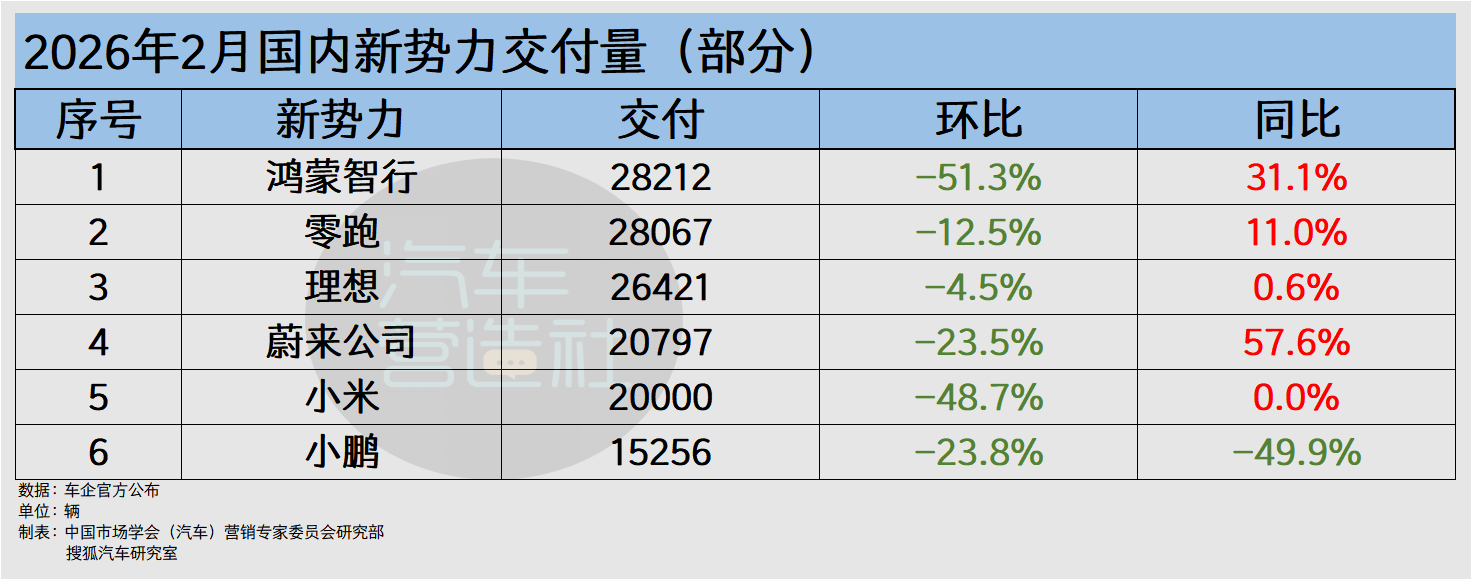 國內新勢力陣營中,2月的交付數據呈現出明顯的分化態勢,環比下滑、同比正增是有別于其他陣營的顯著特點。