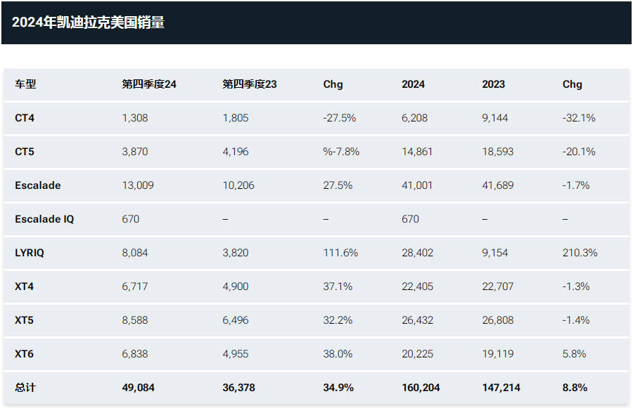 2024年,凱迪拉克在美國銷量達 160,204 輛,相比 2023 年增長 8.8%,迎來自 2016 年以來表現最好的一年。銷量增長得益于凱雷德(Escalade)和銳歌(Lyriq)的強勁需求。